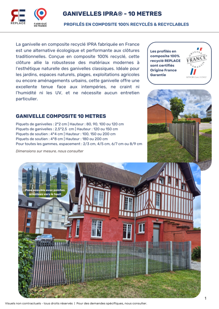 Pour agrémenter ou délimiter les espaces publics, jalonner les bords de chemin, nos ganivelles s'installent facilement, sans échardes et sans entretien ! Elles résistent aux intempéries et au développement de mousses. Les profilés REPLACE sont facilement recyclables en fin de vie. Vous voulez en savoir plus ? Contactez-nous via notre formulaire de contact !